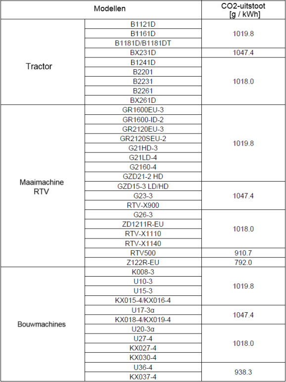 De lijst met uitstootresultaten per model op grond van de EU Stage V CO2 norm